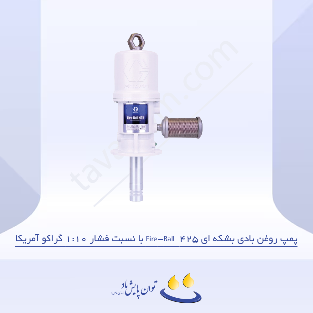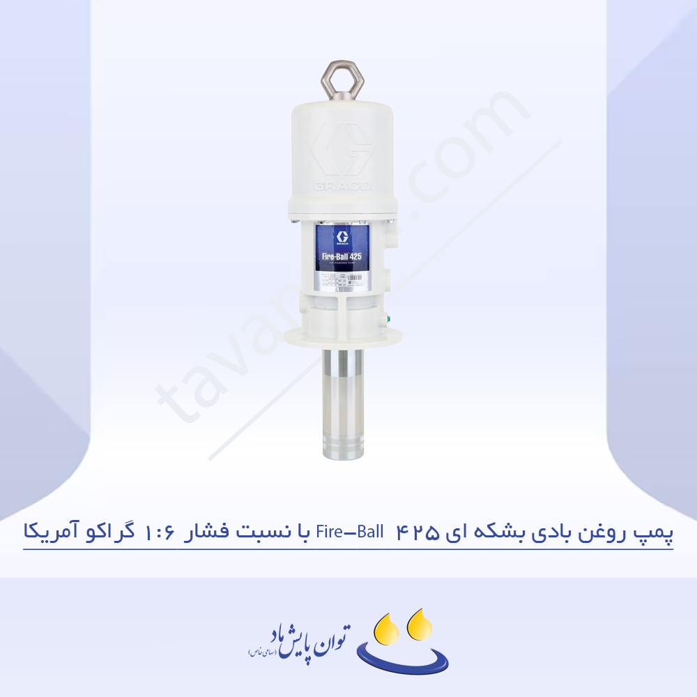 پمپ روغن بادی بشکه ای Fire-Ball 425 با نسبت فشار ۱:۱۰ یکی دیگر از محصولات شرکت گراکو (Graco) آمریکا برای انتقال روغن در حجم بالا و فشار متوسط به بالا است. این پمپ با موتور بادی ۴٫۲۵ اینچی و طراحی مقاوم، برای خطوط طولانی و محیط‌های صنعتی سنگین ساخته شده و دوام و بهره‌وری بالایی را ارائه می‌دهد. استفاده از این پمپ در کارگاه‌ها، ناوگان حمل‌ونقل، صنایع خودرویی و کارخانه‌ها باعث افزایش بهره‌وری و کاهش توقف‌های ناگهانی می‌شود.