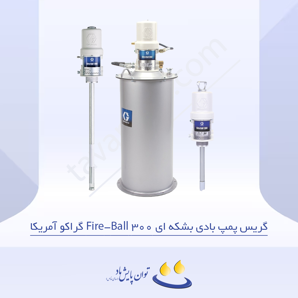 گریس پمپ بادی بشکه ای Fire-Ball 300 گراکو آمریکا با نسبت فشار 50:1 یک گریس‌پمپ بشکه‌ای به‌شمار می‌آید و در صنایع مختلف به‌عنوان ابزاری مناسب برای روانکاری شناخته می‌شود. این گریس‌پمپ به‌دلیل طراحی مهندسی‌شده و تعداد کم قطعات مکانیکی، دوام و عمر طولانی دارد و تعمیرات آن بسیار ساده است. گریس پمپ فایربال 300 در محیط‌های بسیار سخت از جمله دماهای پایین و شرایط آلوده عملکرد بی‌نقصی دارد؛ به‌طوری که در معادن سردسیر تنها گریس‌پمپی که بدون مشکل کار می‌کند همین مدل است.